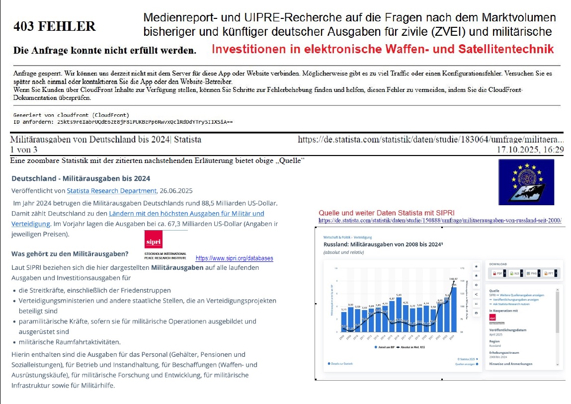 Als die Redaktion von Medienreport und UIPRE mit den Medienverantwortlichen des ZVEI (Zentralverband der Elektroindustrie, Frankfurt) und mit dem BDSV e.V. (Bundesverband der Deutschen Sicherheits- und Verteidigungsindustrie e.V., Berlin) in diesen Tagen telefonierte und das politisch begründete erhöhte Volumen der Ausgaben und „Sicherheitsinvestitionen“ für vorgebliche oder echte Kriegsgefahren etwa in elektronische Waffensystem und in die Satelliten- und Weltraum-Technik hinterfragen und einordnen wollte, stieß der recherchierende Redakteur auf eine Reihe von Namen, wie Statista oder SIPRI, die allesamt schreibenden Kollegen und der Öffentlichkeit offenbar unbekannt blieben. Dem BDSV und dem Verteidigungsministerium unter Minister Boris Pistorius und den Militaristen unter den Militärs werden also allesamt scheinbar die unbekannte Wirklichkeit vorenthalten. Wie man Putin, Trump, Protistuierer und Patridioten mit Kapital überlebt, braucht Vorstellungen. Wer die Adresse www.bmvg.de aufruft, findet darin plakativ, aktualitäts- und realitätsfern die Seifenblasen, die am schönsten wirken, wenn sie gerade geboren wurden: